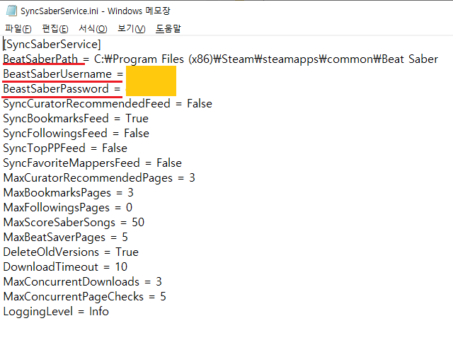 - BeastSaberUsername = bsaber.com사이트의 id 를 적어줍니다.